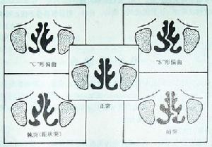 中隔偏曲依其偏曲方向,有偏向一侧的C型,也有偏向两侧的S型,依其形态有嵴突(半圆形突起)和矩状突(尖锐突起)两种。外伤造成的鼻中隔软骨脱位,有时可突于鼻前庭。